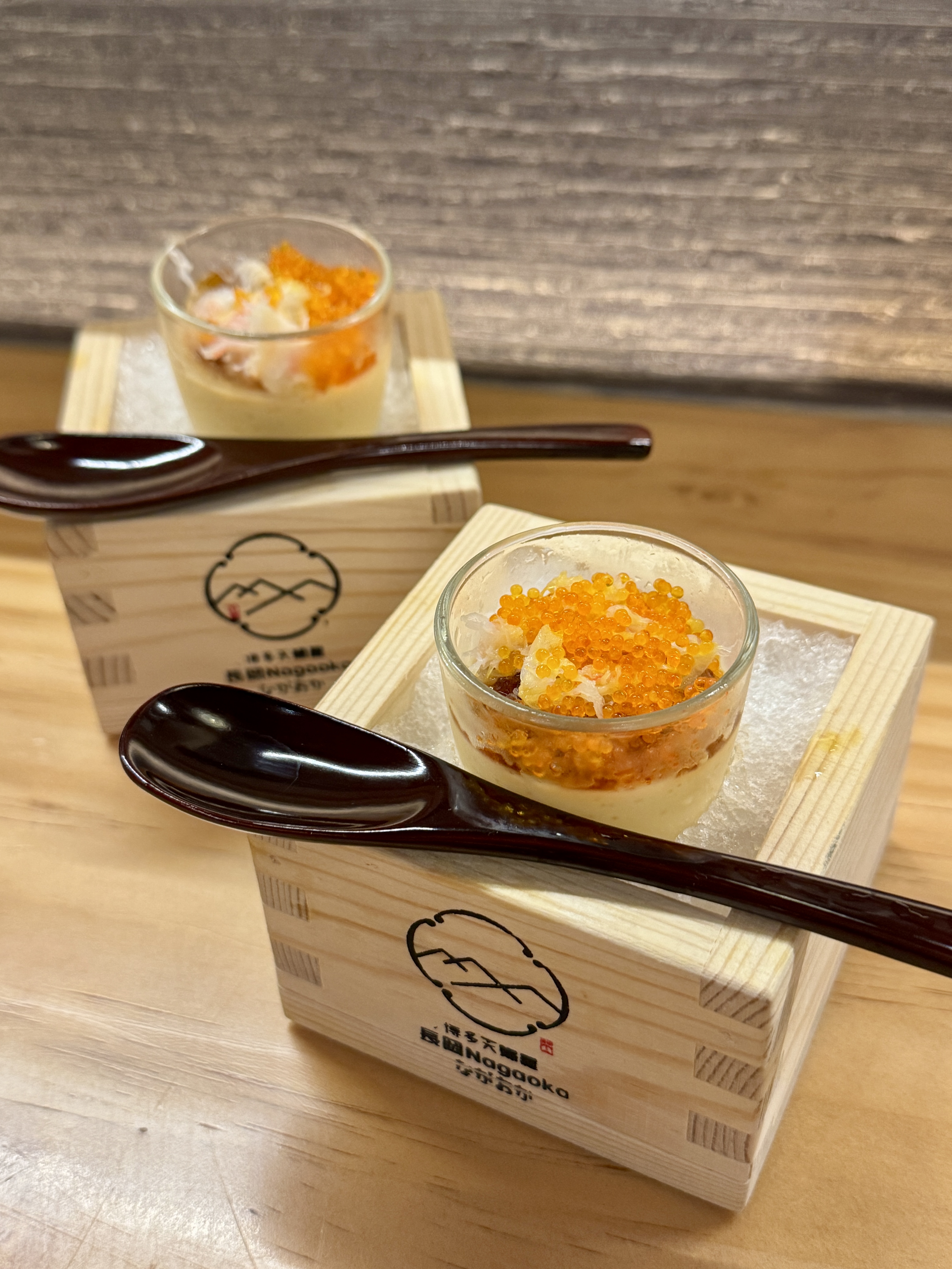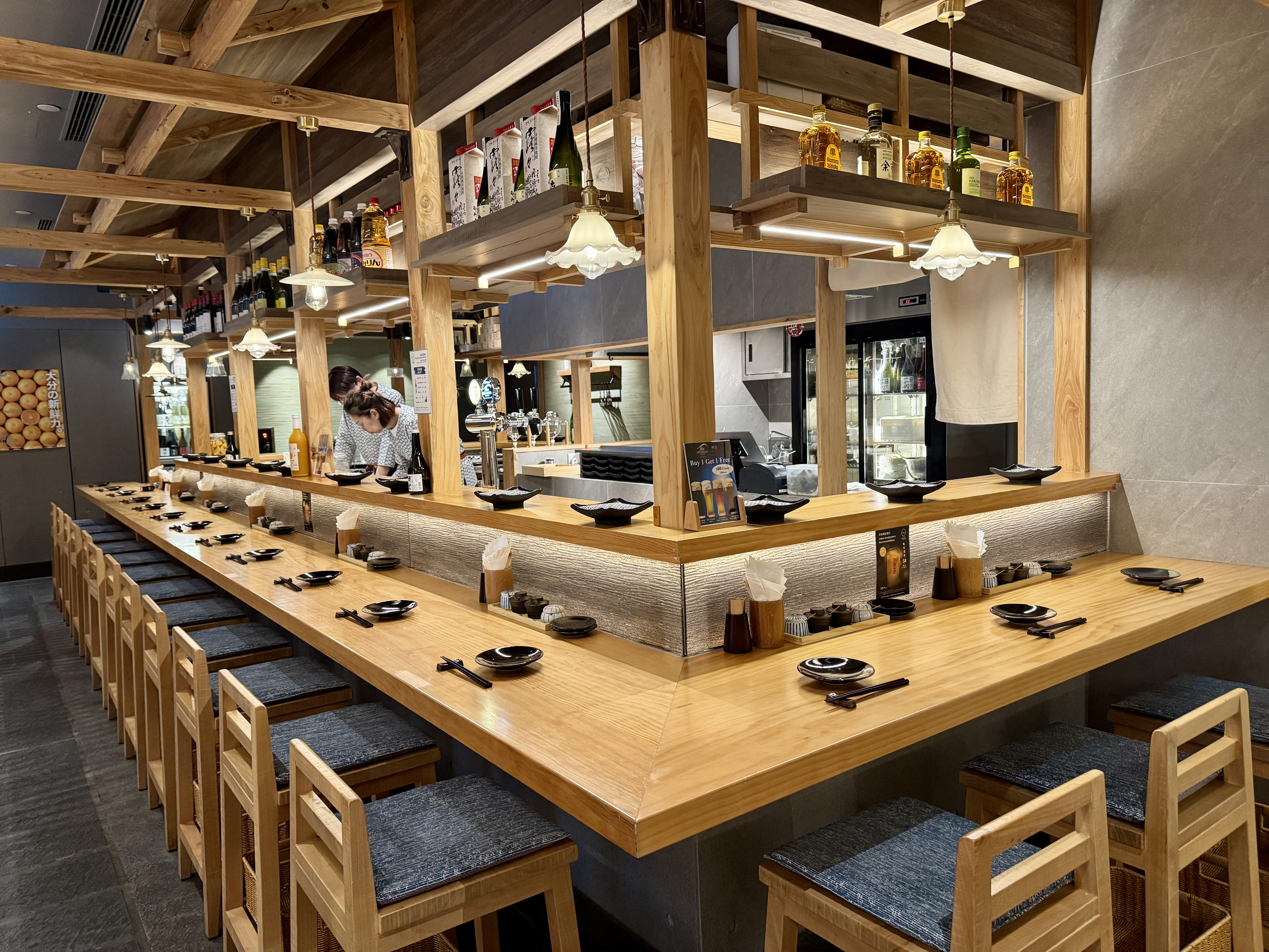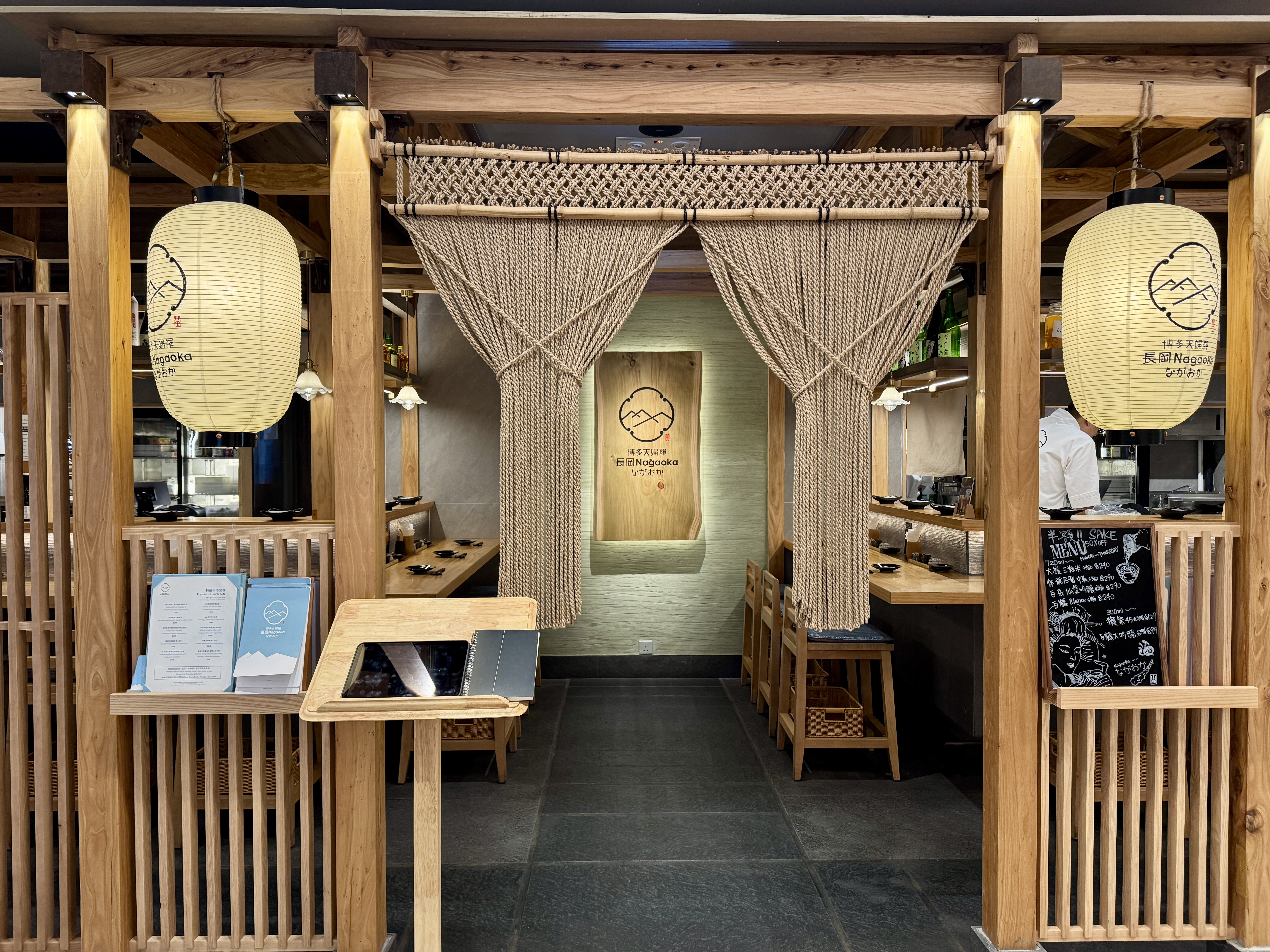 餐廳環境充滿福岡屋台的熱鬧氛圍,以原木為主要材質,木質裝潢溫暖自然,開放式吧檯設計讓客人能近距離欣賞師傅即點即炸的過程,香氣四溢,氣氛親切又充滿職人精神。店內燈光柔和,木欄杆與吊燈營造出輕鬆休閒的日式居酒屋感覺,坐在吧檯位特別有沉浸感,就像置身福岡街頭小店一樣。這晚用餐時,更意外遇上了前金管局總裁任志剛先生,他同樣前來品嚐博多天婦羅,與有榮焉!