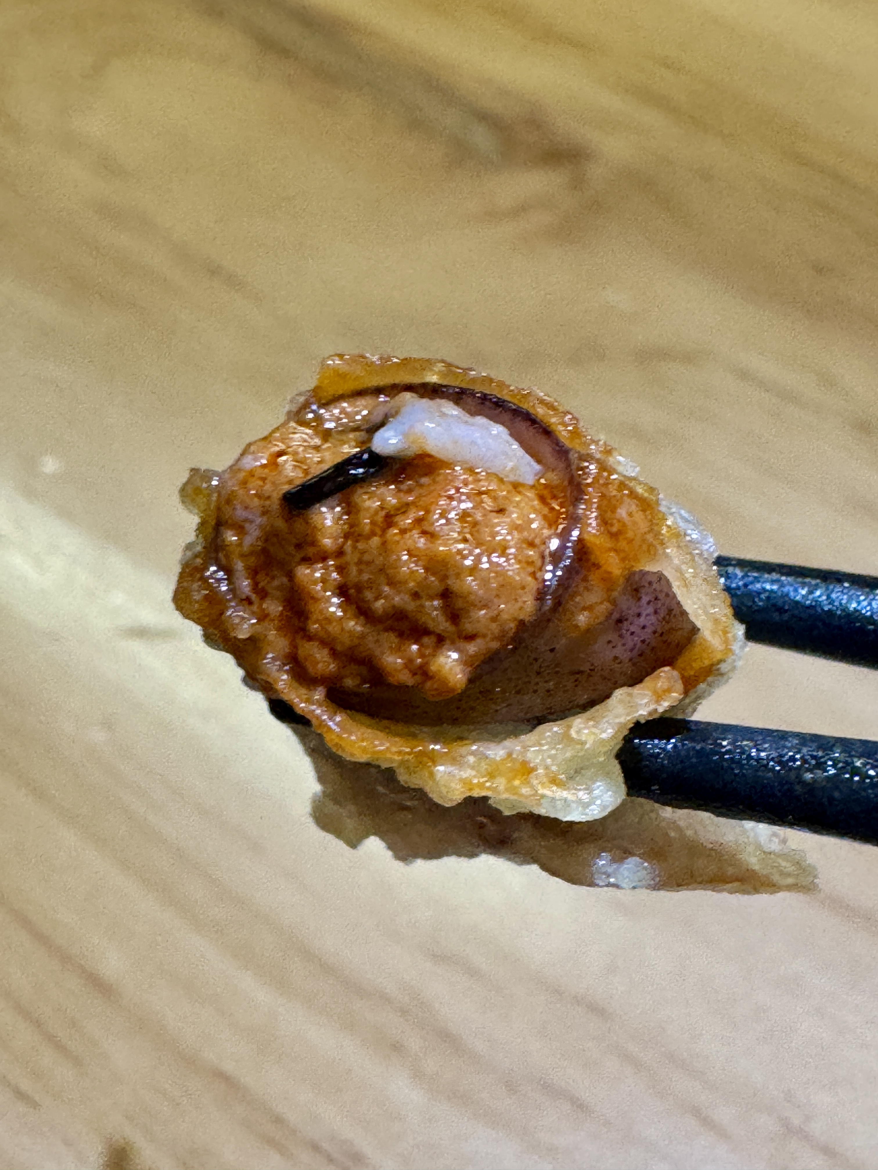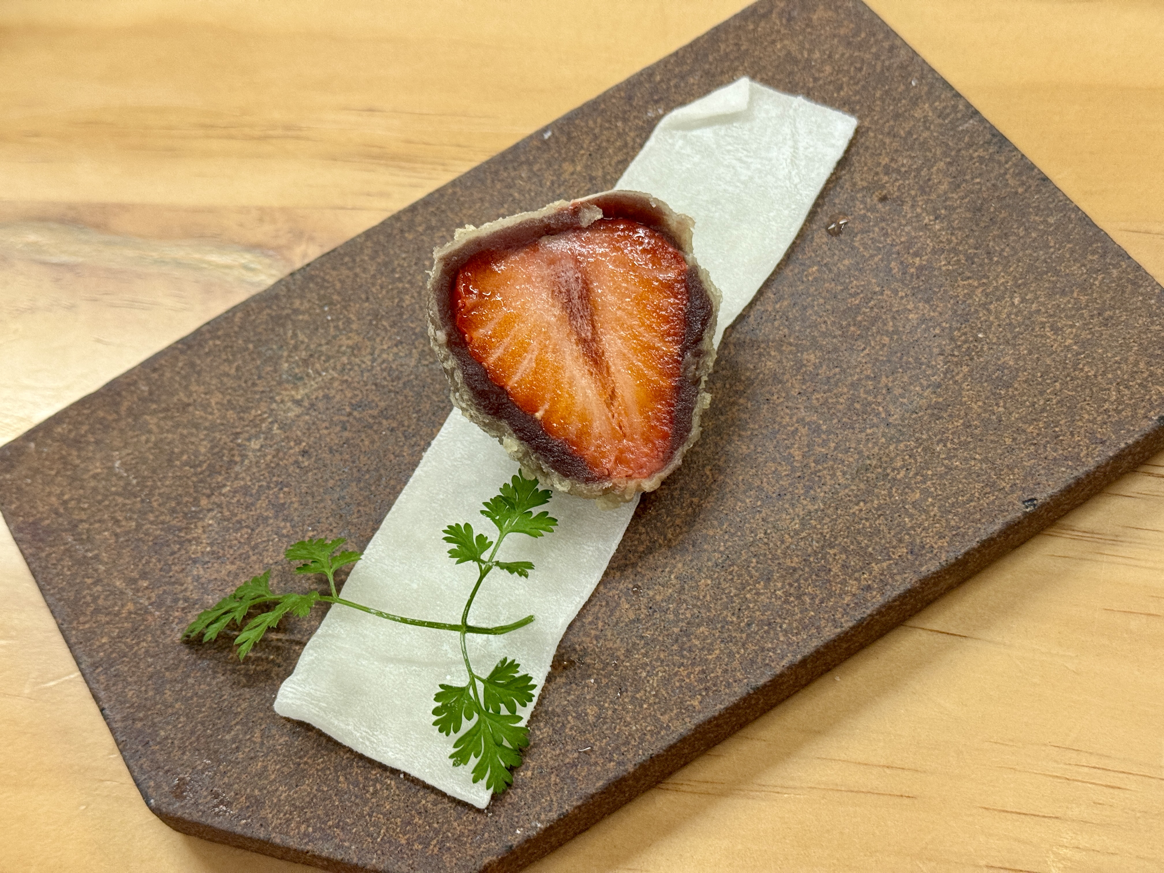 甜品竟然也是天婦羅!廚師將士多啤梨紅豆蓉輕輕炸過表面,炸衣薄脆輕盈,內裡依然保持清新果香與紅豆的綿密,自己親手包上軟糯麻糬,酸甜平衡又帶有驚喜口感,作為收尾既特別又完美。如果喜歡甜品天婦羅,這款絕對值得一試!