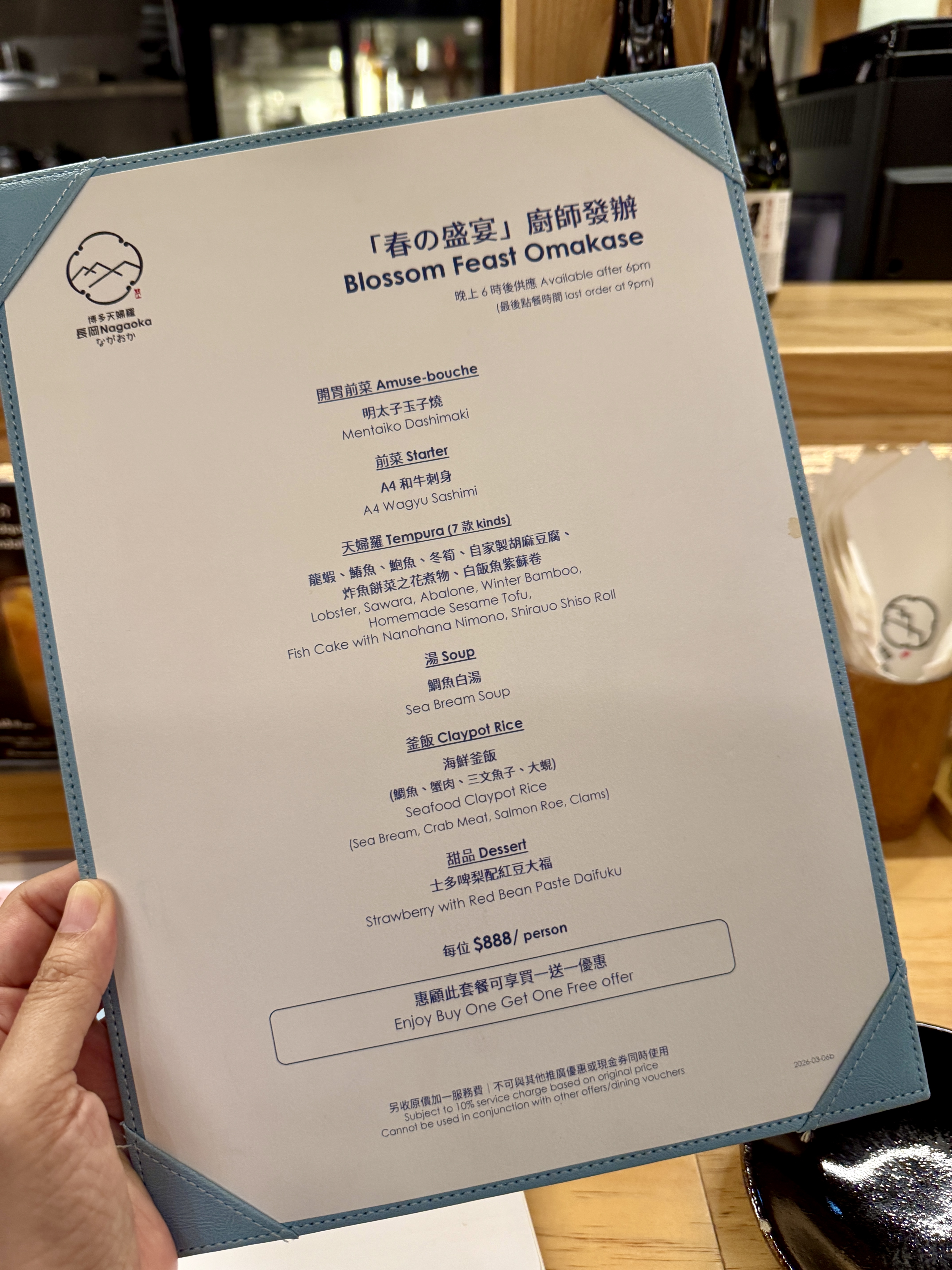 因為知道有買一送一優惠,這天來到銅鑼灣利園三期,品嚐長岡博多天婦羅的「春の盛宴」廚師發辦。這個套餐共有12道菜,博多風格的天婦羅充滿創意,完全打破了我以往對天婦羅只有鮮蝦、南瓜、番薯的刻板印象,甚至連甜品都能變成天婦羅,吃後才知道天婦羅的世界原來如此廣闊。